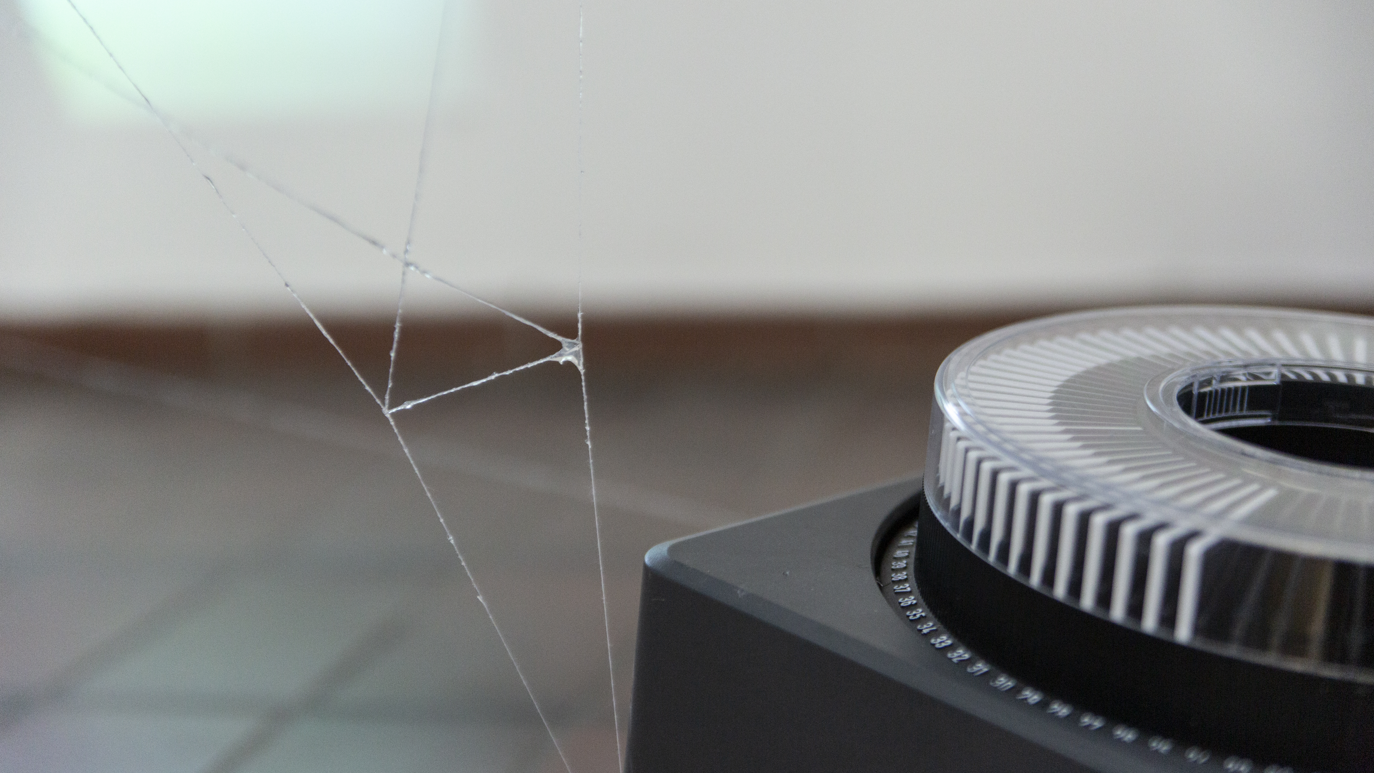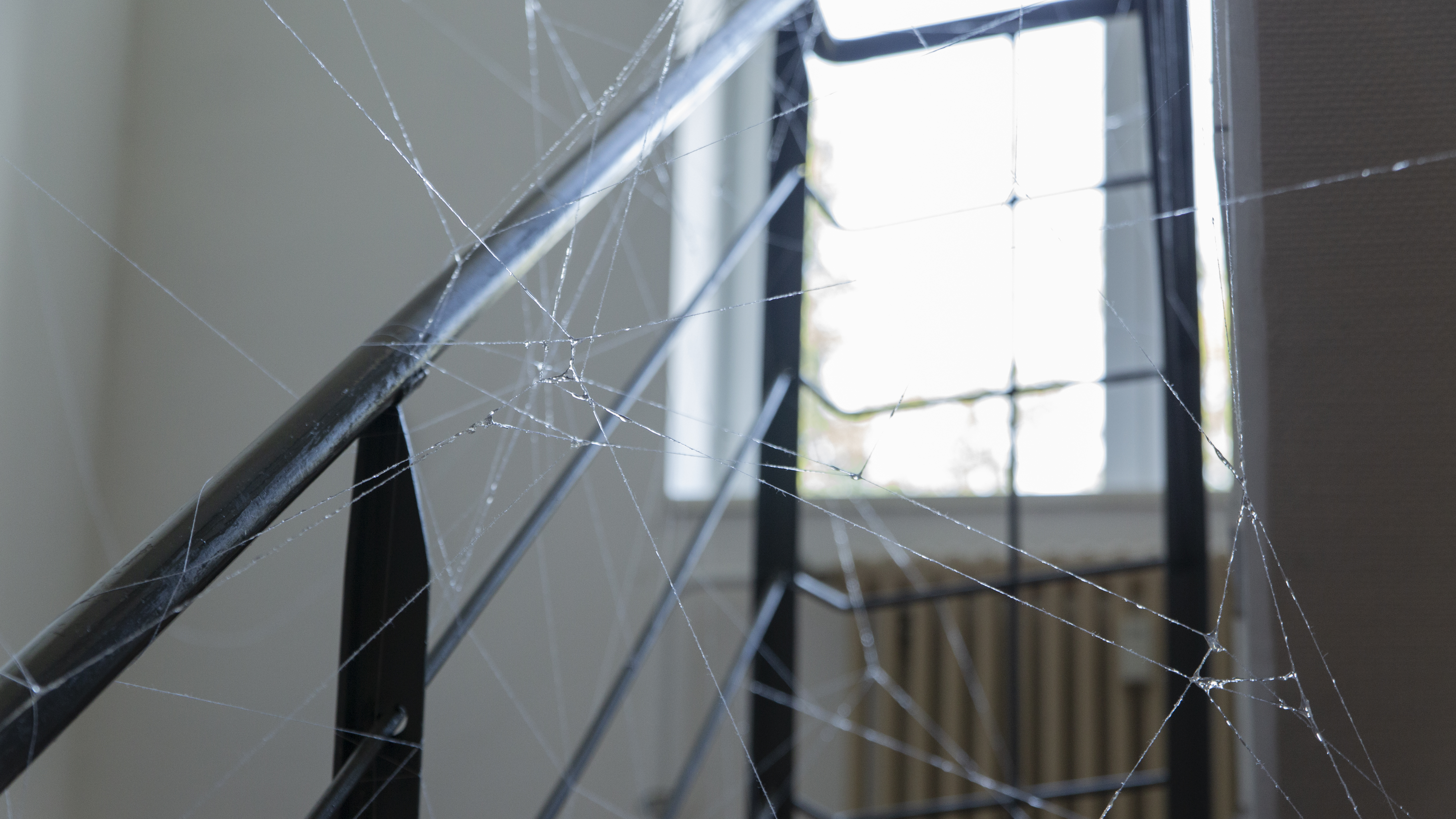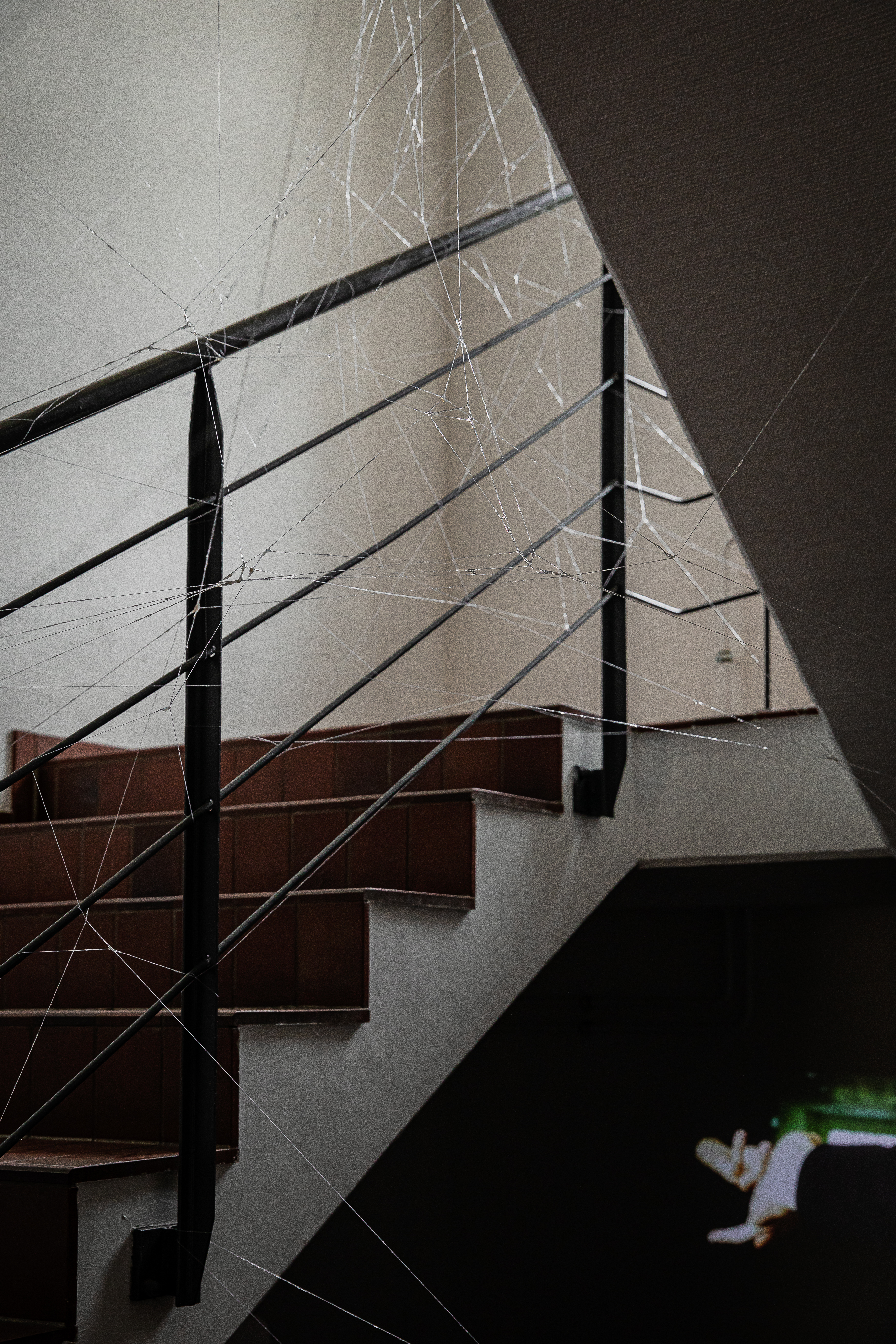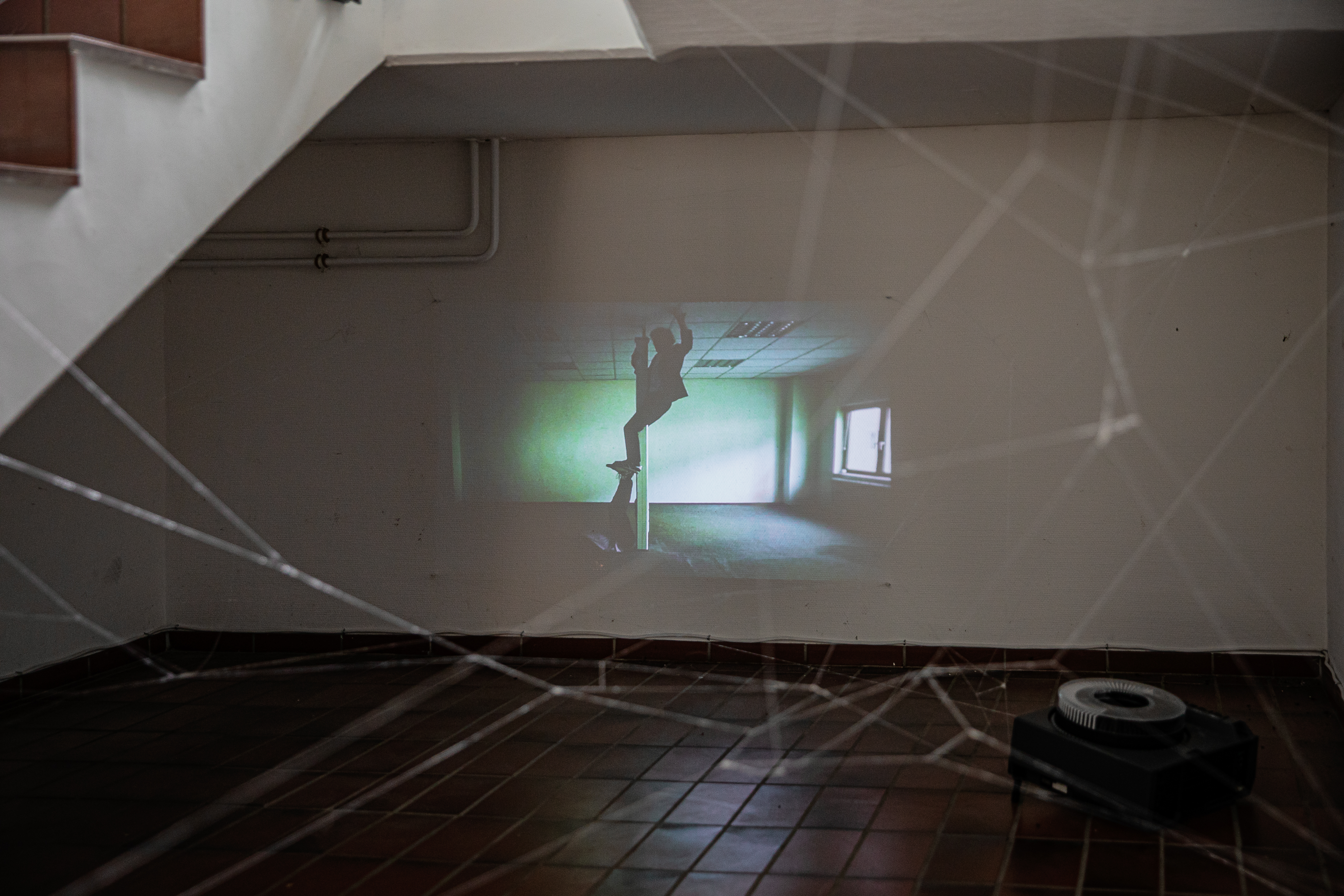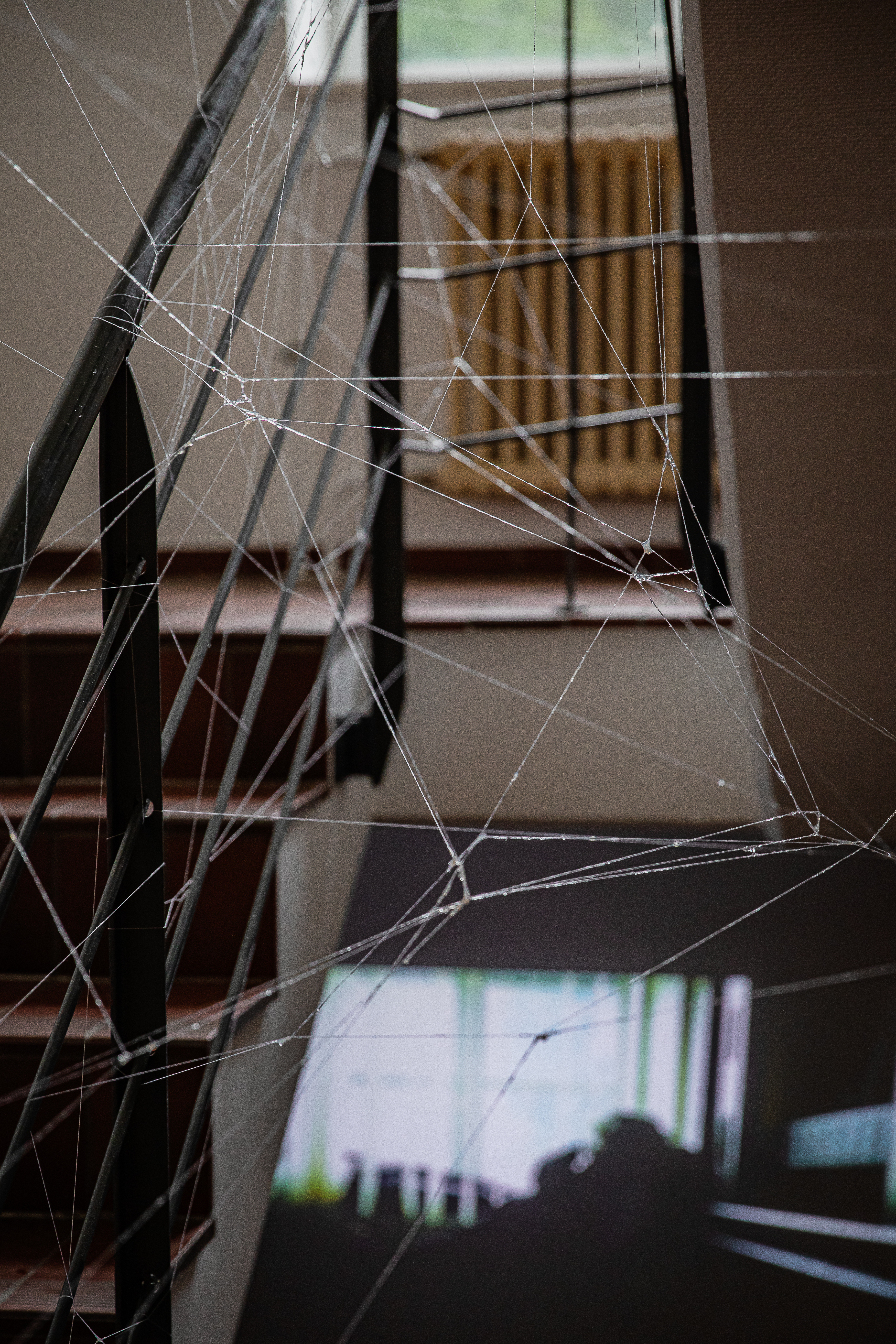 Tucked beneath a flight of stairs, a web of stings and slide projector become a single being. An empty and forgotten space transforms into room for possibility. Strings run through the slide projection to images, from bannister to a wall shaded by a poster that once hung. By following the strings and the materials they connect, every absence becomes a presence, and empty space materializes. This piece exists in the land of in-between: the natural and the artificial, the real and the imagined, the material and the ethereal.